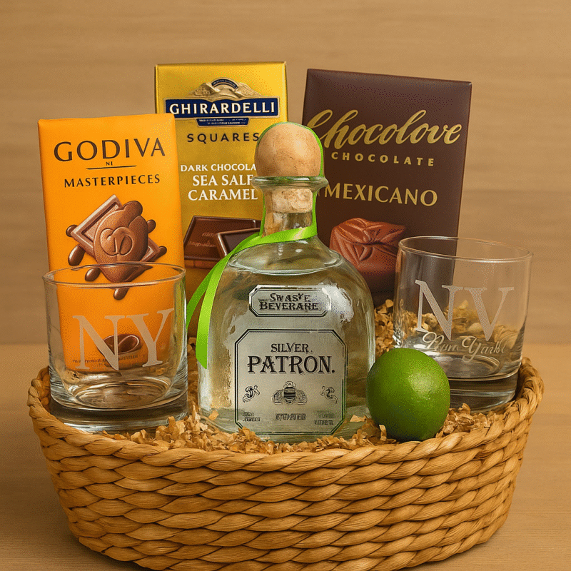 Each basket begins with your choice of bottle, which can be engraved with a personal message, logo, or date to create a keepsake that lasts well beyond the holidays. Surrounding your bottle, you’ll find elegant additions such as artisan chocolates, pretzels, smoked nuts, cheese spreads, and cocktail accessories.