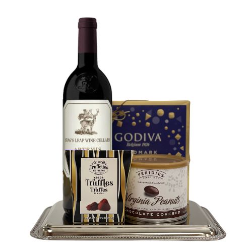 Everything is arranged on a gleaming silver tray, designed not only to present beautifully but also to double as a keepsake serving piece for future entertaining. From the wine to the sweets, every detail in this basket is designed to please the senses and impress the recipient.