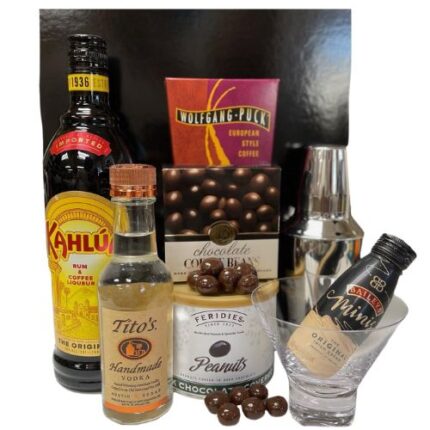 Espresso Martini Cocktail Kit is the ultimate gift for anyone who loves the bold flavor of coffee with a kick. This beautifully arranged cocktail kit includes everything needed to make the perfect espresso martini at home. Inside, you’ll find a full-size bottle of Kahlúa Coffee Liqueur, a mini bottle of Baileys Irish Cream, a mini bottle of Tito’s Handmade Vodka, and Wolfgang Puck European-style coffee to tie it all together. Whether it’s for a holiday, birthday, or a classy girls’ night in, this kit is always a hit.