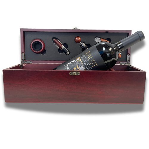 This gift set is not just about the wine—it is about the full ritual of enjoying it. The Faust Cab Wine & Tool Box includes an elegant wooden case lined with essential wine tools: