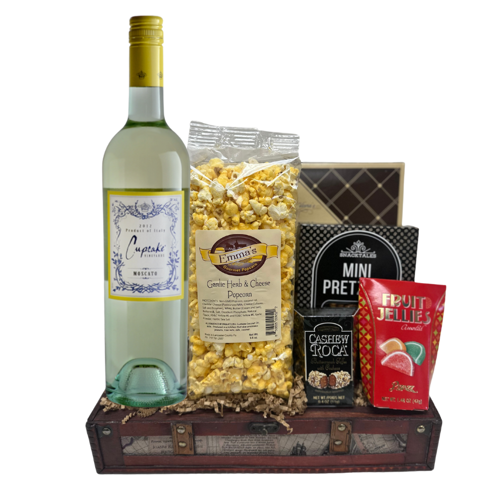 At the heart of this basket is Cupcake Moscato, a luscious Italian wine known for its vibrant peach, apricot, and floral notes. Its refreshing sweetness and delicate bubbles create a light, joyful finish — perfect for pairing with savory snacks or rich desserts. The Moscato Holiday Gift Basket is both festive and refined, designed to bring happiness to every recipient.