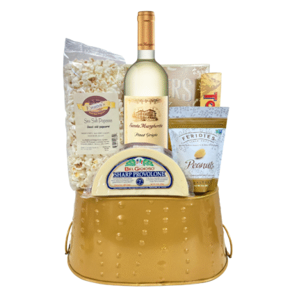 Every Pinot Grigio Lovers Gift Basket is a reflection of Pompei’s dedication to quality and presentation. Inside, you’ll find buttery sea-salt popcorn, sharp provolone cheese, Feridies gourmet peanuts, and rich caramel toffee — all beautifully arranged in a hammered gold keepsake basket. Each bite enhances the lively acidity and fruit notes of the Pinot Grigio, creating a harmonious pairing that feels luxurious yet effortless.